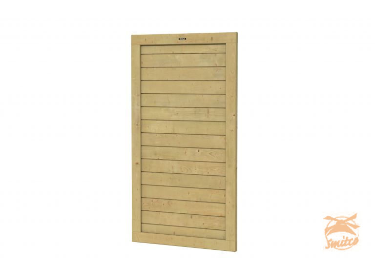 Met horizontale planken. Planken glad geschaafd met veer- en groefverbinding. Vurenplanken 1,8 cm dik, vuren raamwerk 4,5x9 cm. Deur is aan beide zijden even mooi.Exclusief hang en sluitwerk.