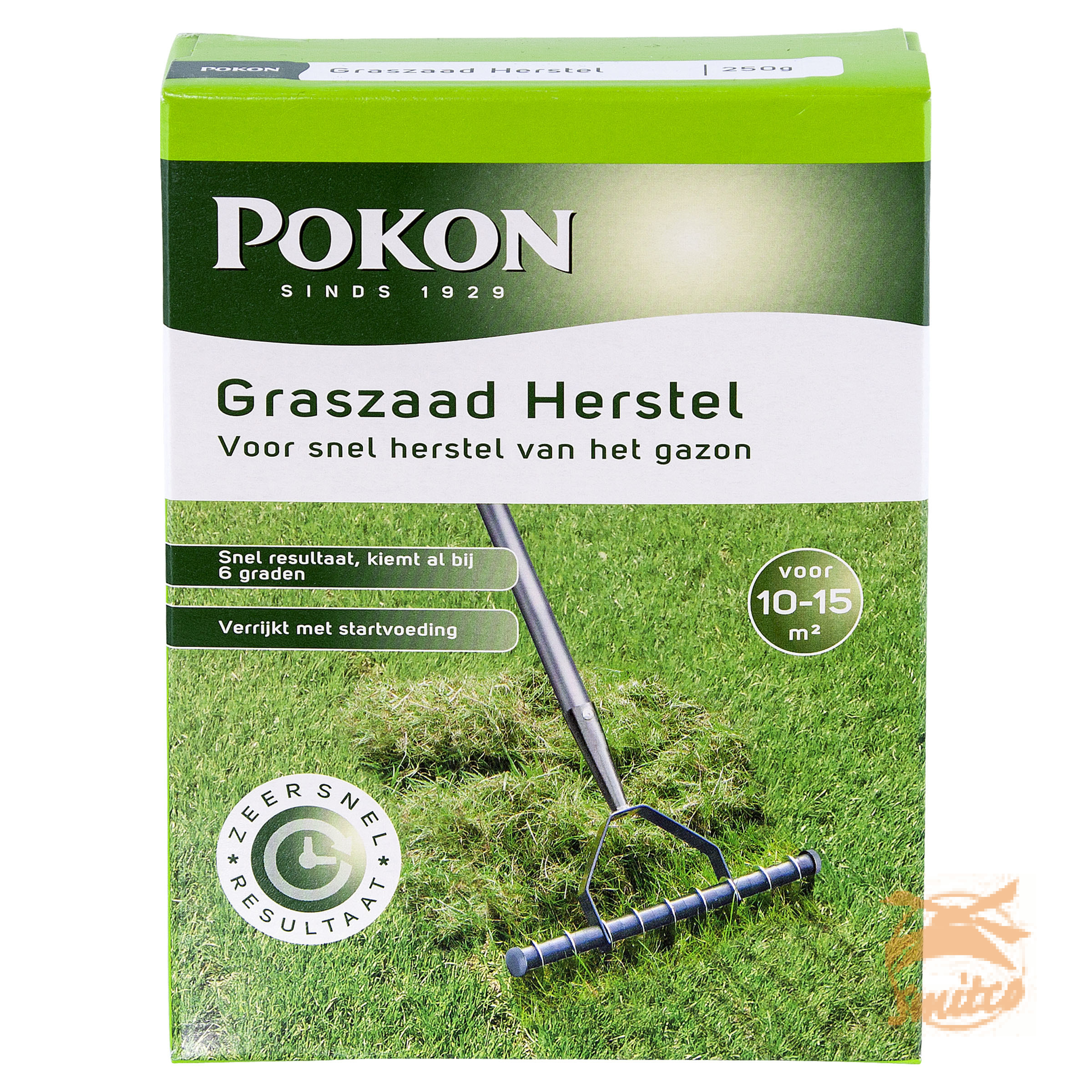 Kale plekken in je gazon kunnen ontstaan na de winter of na het verticuteren. Met Pokon Graszaad Herstel is je gazon supersnel weer egaal groen. Het graszaad kiemt al binnen 1 week, zelfs bij een bodemtemperatuur van 6°C. Je kunt Pokon Graszaad Herstel ook gebruiken voor het doorzaaien van het gazon.Kale plekken herstellen: Maak de kale plekken vrij van mos en onkruid en hark de grond los. Breng een laagje Pokon Gazongrond aan en egaliseer dit.