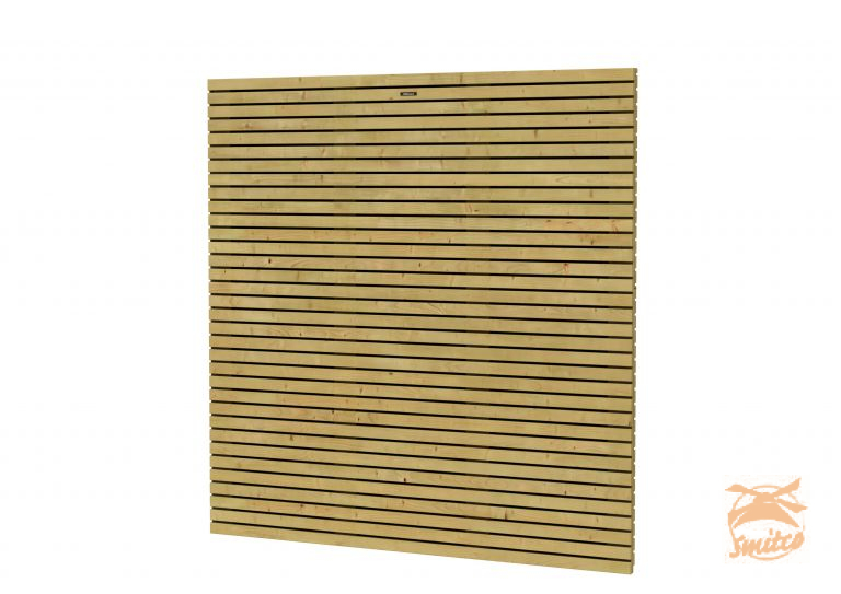 Het Elanscherm heeft een verfijnde vormgeving met aan 2 zijden balkjes met ca. 1 cm tussenruimte. Vuren balkjes 1,3x4,4 cm op tussenlatten 1,6x9,5 cm. Bovenzijde afgewerkt met geïntegreerde afdeklat.Verpakking